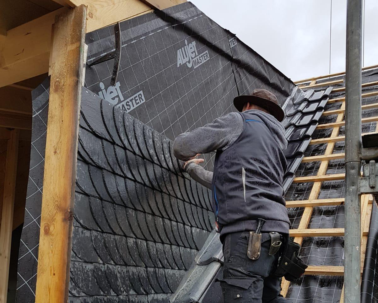 Insbesondere der Baustoff Schiefer erlebt in den letzten Jahrzehnten eine beeindruckende Renaissance. Seine Vielseitigkeit, sowohl in Bezug auf Form als auch Farbe, macht ihn zu einer attraktiven Wahl. Schiefer ermöglicht interessante Deckungsarten, zeichnet sich durch seine Langlebigkeit aus und verleiht nicht nur dem Dach, sondern auch Gaubenwangen, Schornsteinbekleidungen und Dachrandabschlüssen eine charakteristische Optik. Entdecken Sie die Möglichkeiten, die Schieferarbeiten für die ästhetische und funktionale Gestaltung Ihrer Immobilie bieten können.